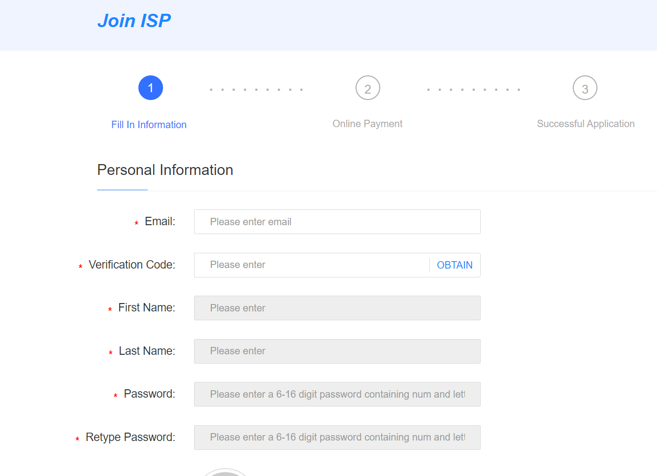 The first step: Click the button of "Join ISP" of the upper right corner of homepage.