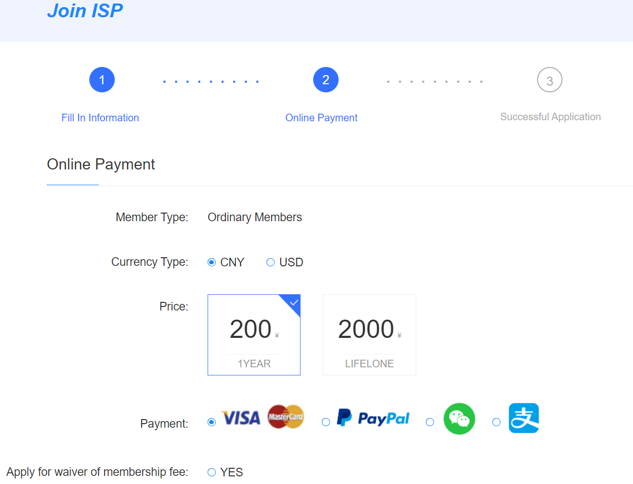 The third step: Pay online(you can choose any type of payment that is avilable for you or you can apply the lifelong menbership for total 2000RMB)
