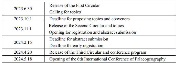 Note: 1) The financial support may cover the conference registration fee, accommodation and round-trip international airfare (economy class only); 2) Those who wish to apply for the supports,please specify "Application for the 6th International Conference of Palaeogeography" in the manuscript submission e-mail or cover letter.